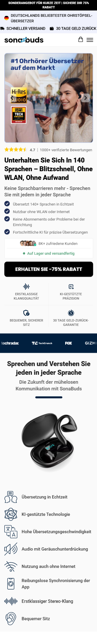 Holen Sie sich die SonaBuds™ zum exklusiven Einführungspreis. Dieses Premium-Audio-Erlebnis ist jetzt für Kunden in Deutschland mit einem massiven Rabatt von 50% für ein einzelnes Gerät verfügbar. Die SonaBuds bieten kristallklaren Sound, ergonomisches Design und eine lange Akkulaufzeit.